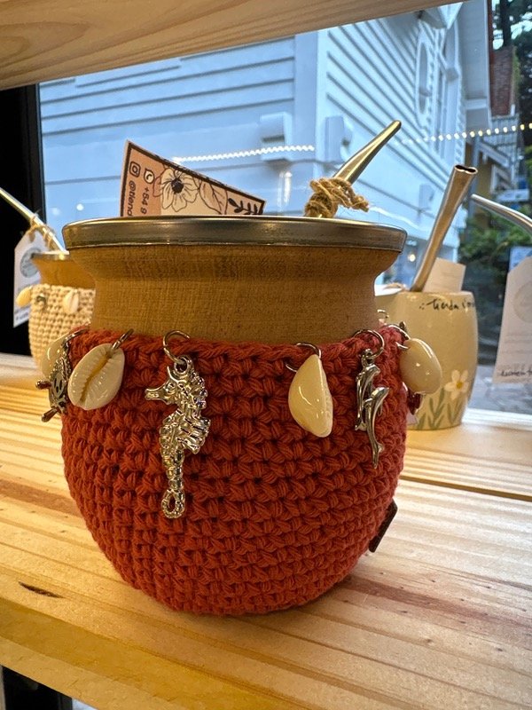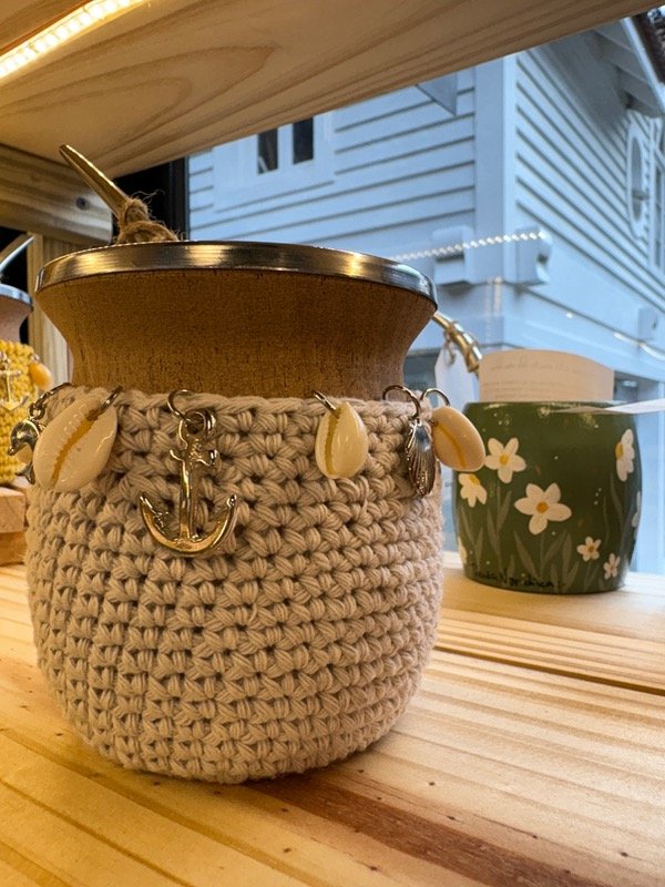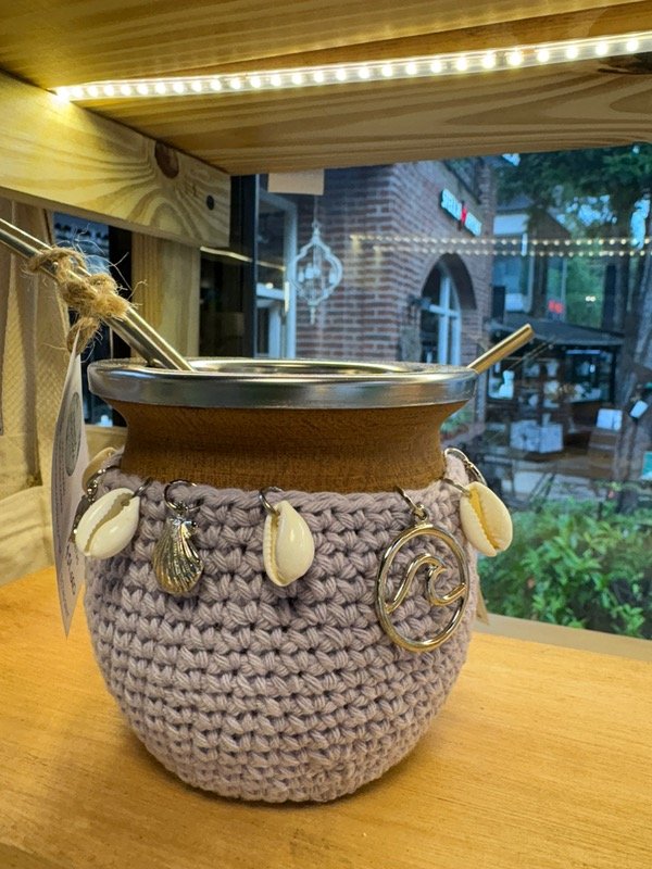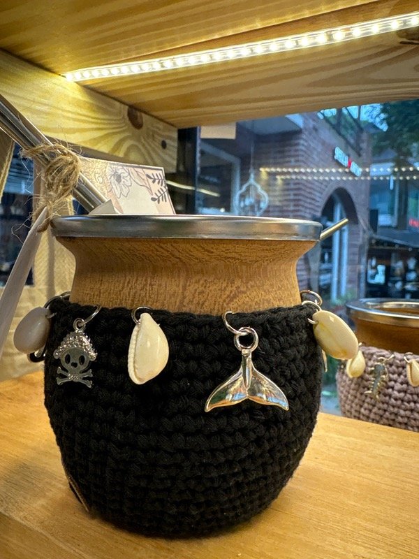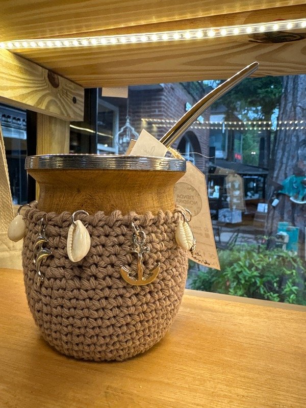 Mate de madera algarrobo, modelo bocon con virola de acero, diseño exclusivo con funda tejida a mano con dijes marinos y caracolitos