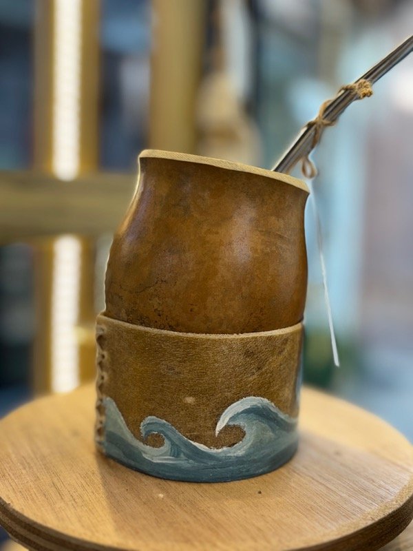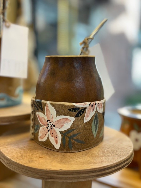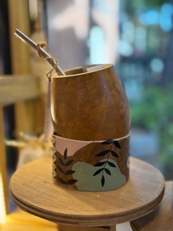 Mate de calabaza con base de cuero (natural) pintada a mano.