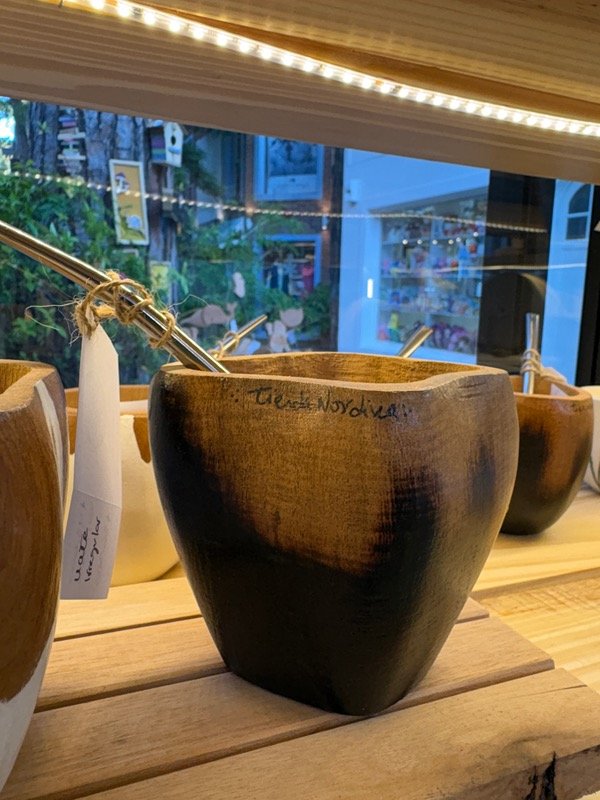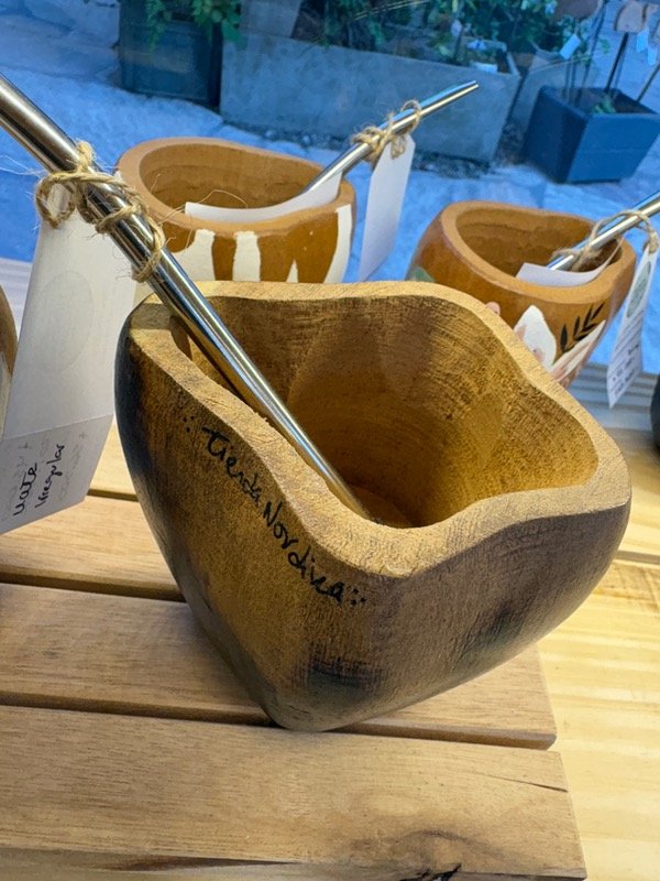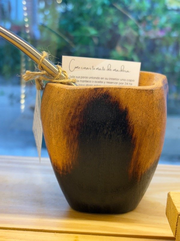 Mate de madera algarrobo, diseño irregular en tendencia, muy cómodo y con una capacidad intermedia.