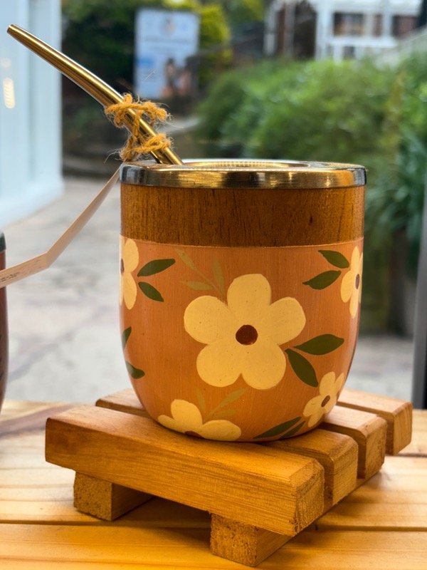Mate de madera algarrobo, modelo Xl con virola de acero, diseño exclusivo pintado a mano.