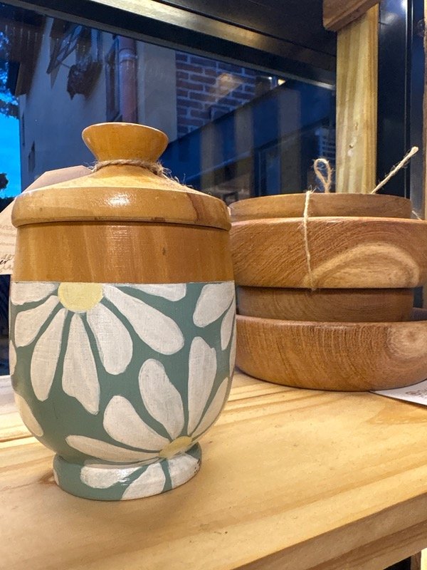 Yerbero o Azucarera con tapa de madera quebracho blanco, con diseño exclusivo pintado a mano
